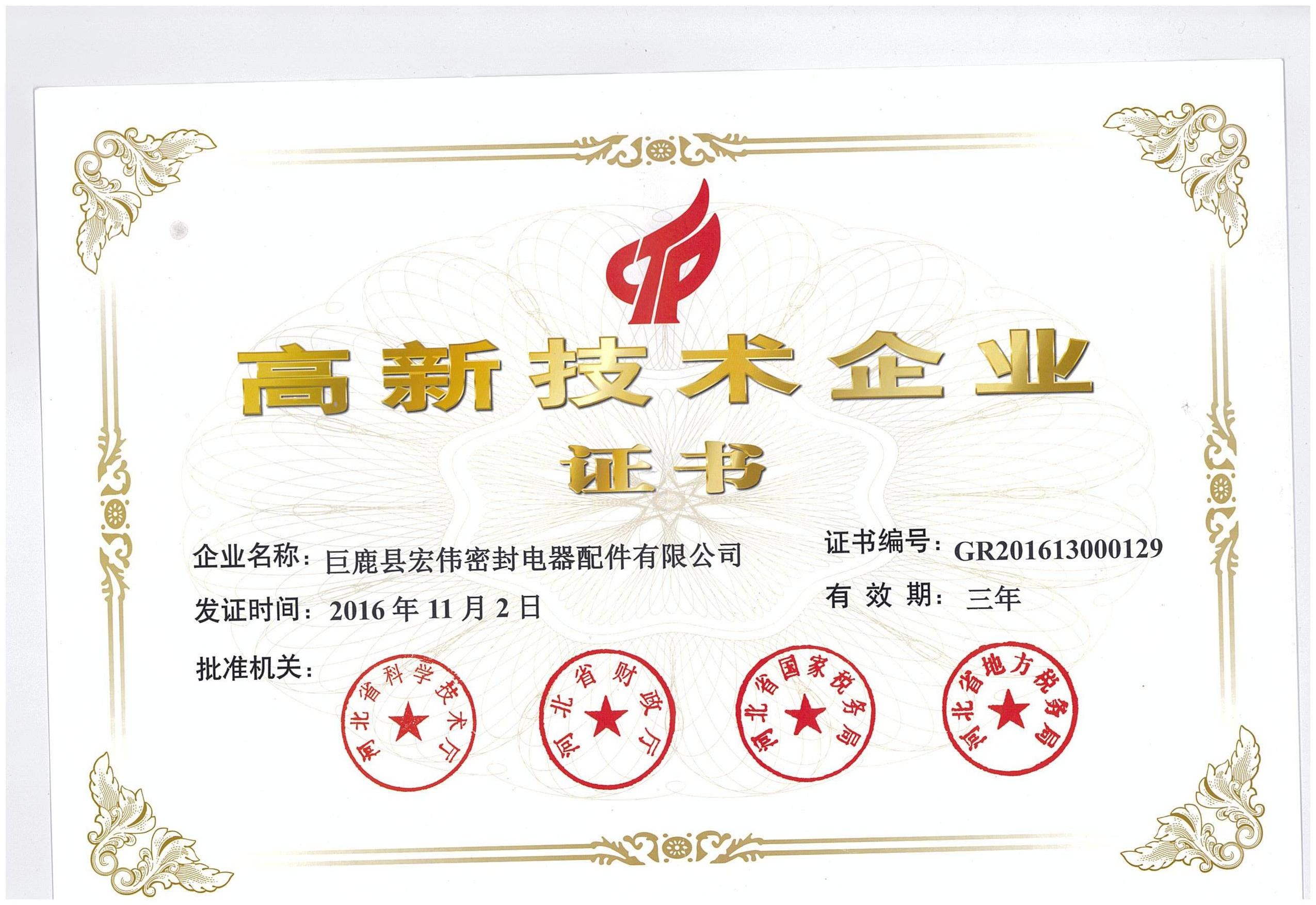 巨鹿縣宏偉密封電器配件有限公司被評為高新...